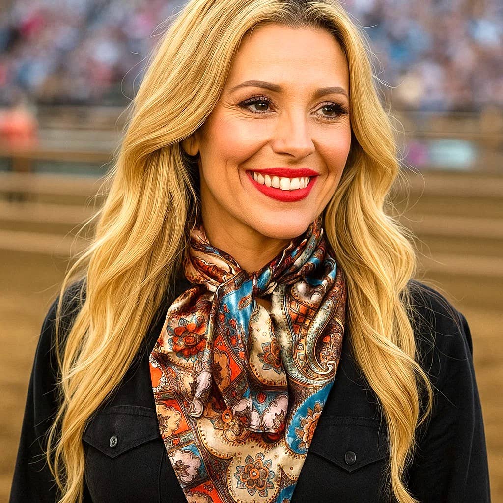 Our classic wild rag/scarf in tan and cream with a paisley pattern. It is a square and measures 35" x 35". It is sure to add a bright pop of color to any outfit.