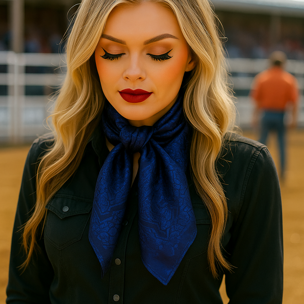 Our elegant wild rag/scarf in cobalt with a rustic desert pattern.