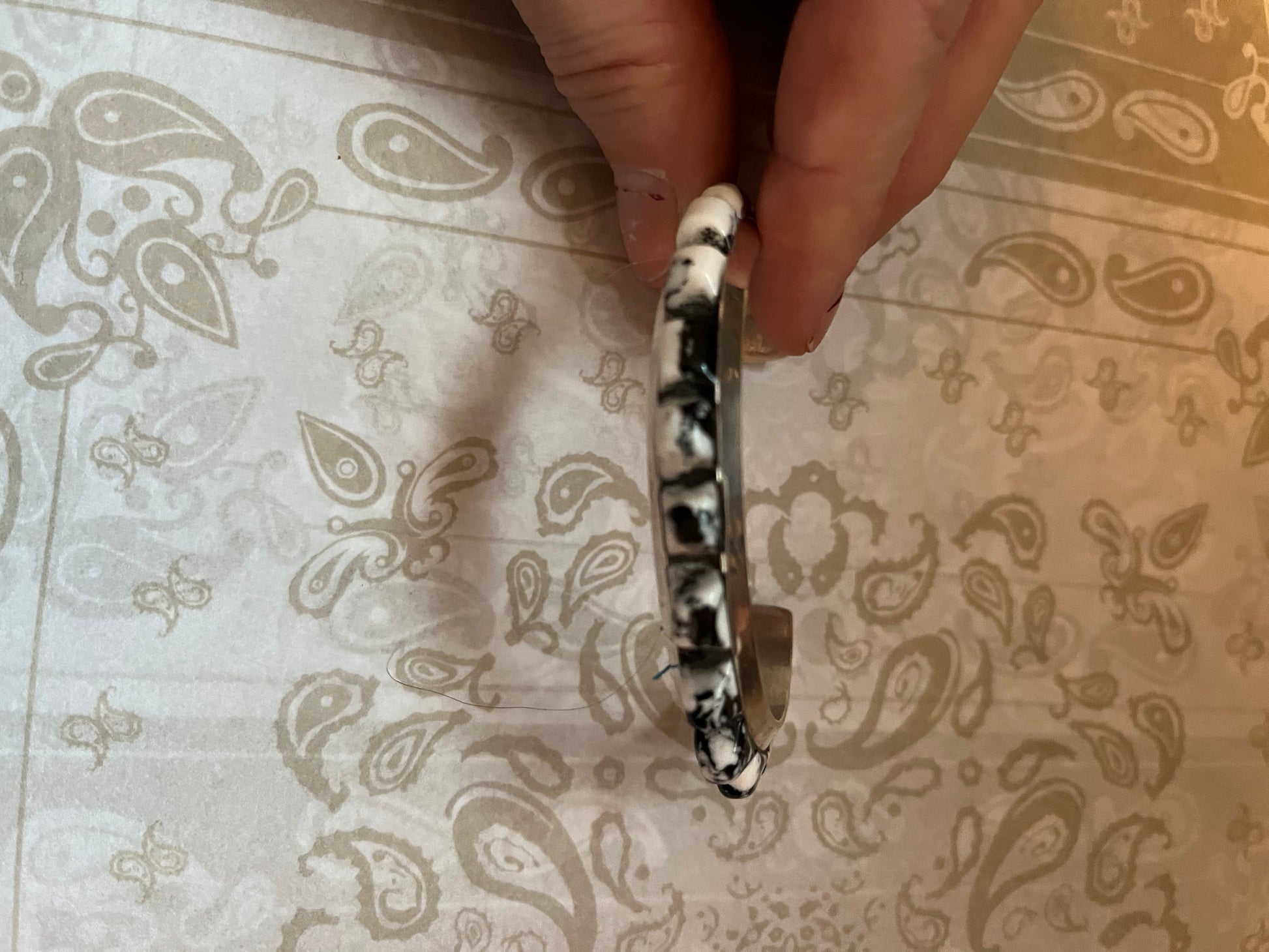 This Beautiful cuff is made of white Buffalo cobblestone and sterling silver. Native American made. Cuff measures 6.5 inches with 1.5 inch opening.