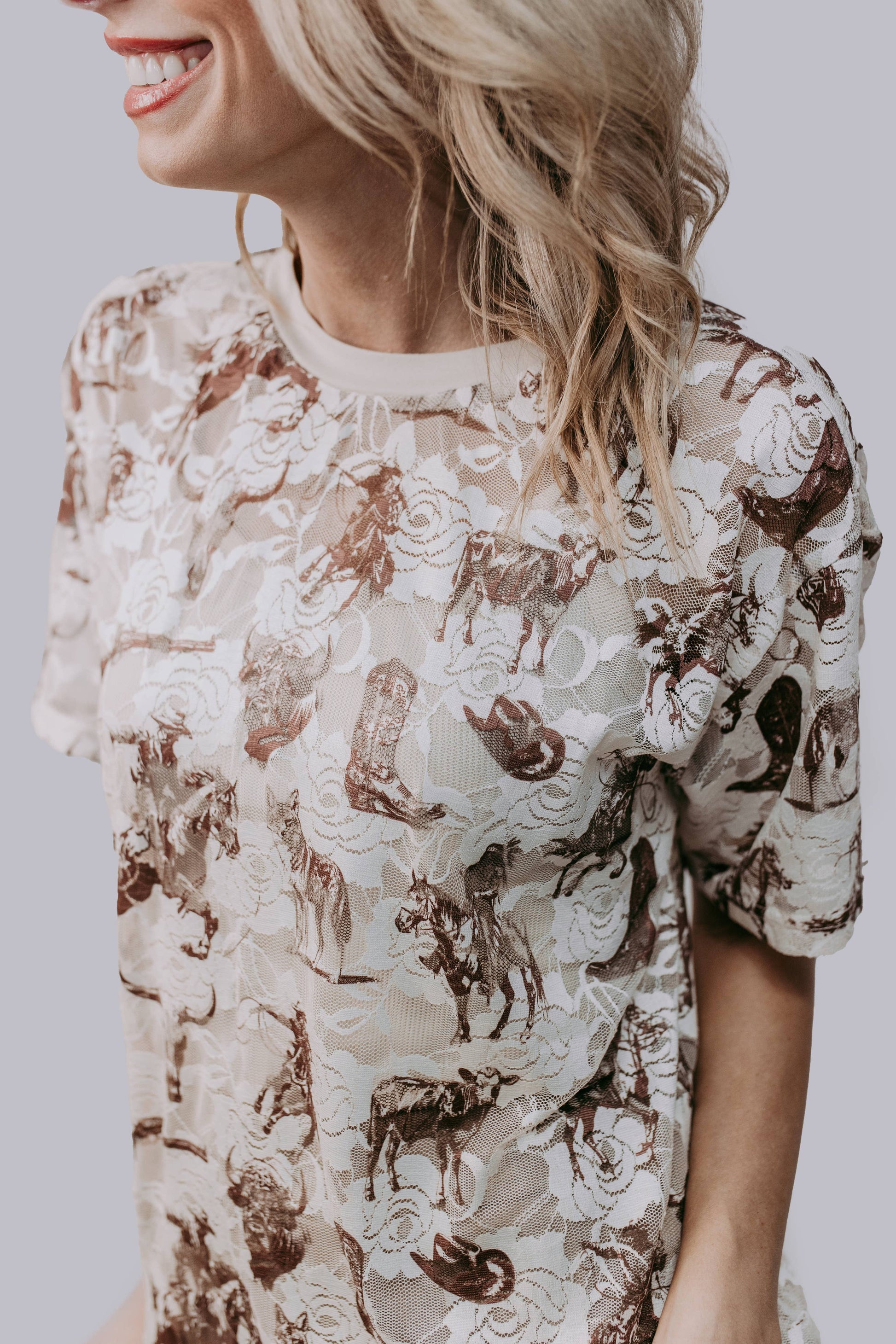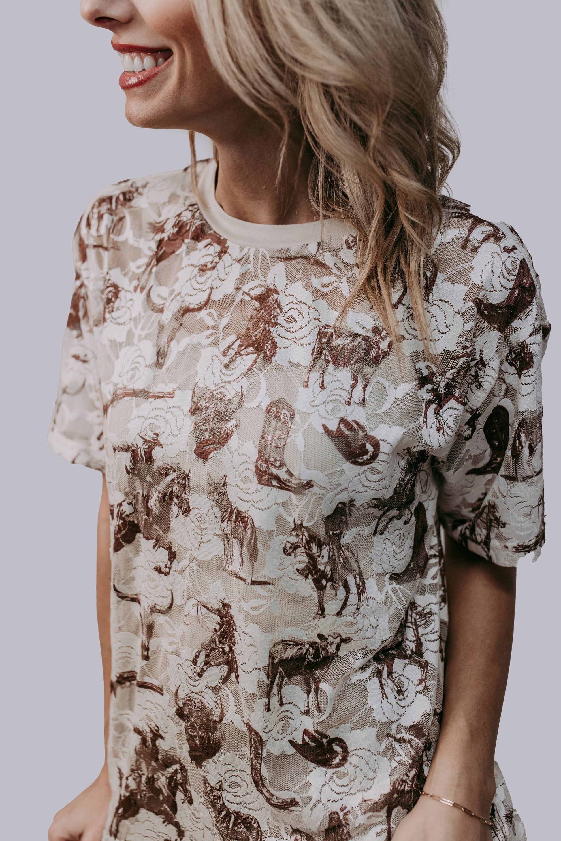 This elegant cream lace top features a distinctive Western print with brown cowboys and Native American motifs. The delicate fabric combines vintage-inspired design with contemporary styling, making it a versatile addition to any Western wardrobe. Perfect for pairing with jeans or a skirt for rodeos, country concerts, or casual outings.
