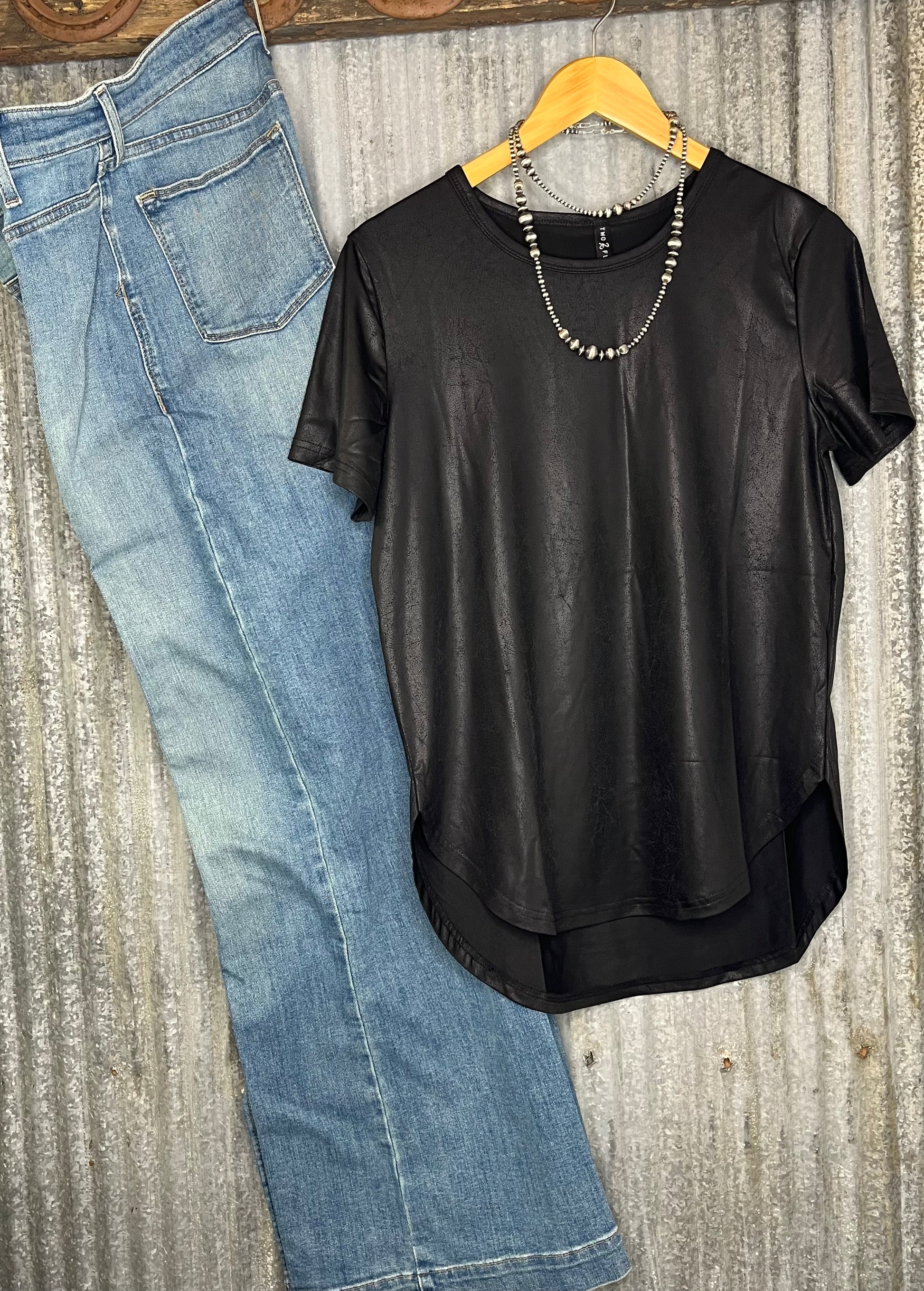 The cutest little basic but not so basic black tee. Feels and looks like leather but buttery soft. perfect for dressing up or down. Looser fitting.