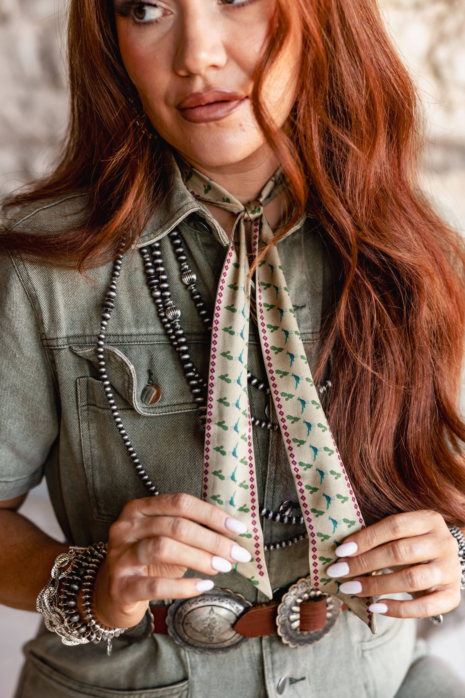 Tan Silk Twilly Scarf with Turquoise Roadrunner