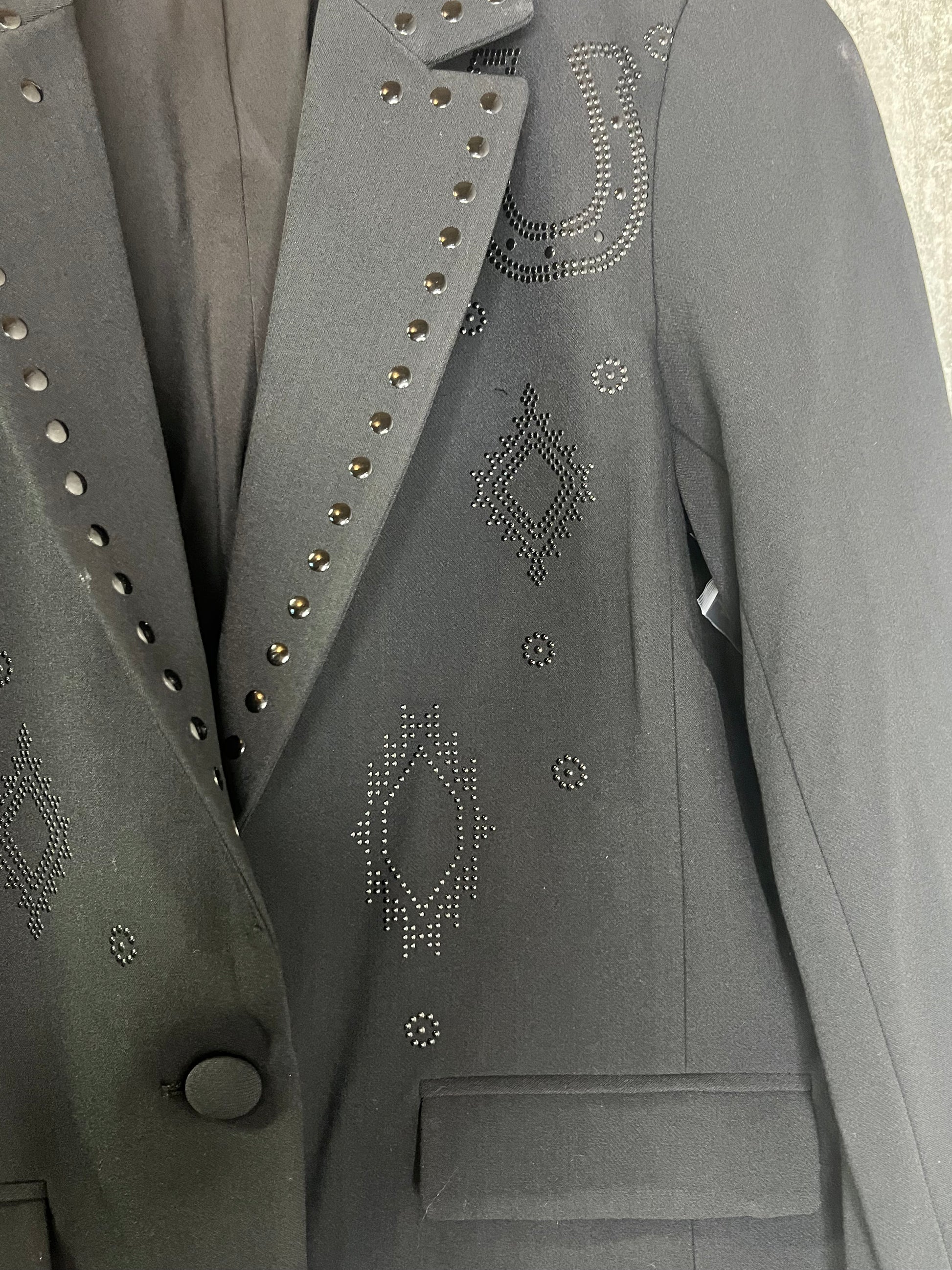 Elevate your style with the Ariat Women's After Party Blazer in Black. Featuring eye-catching western stud and rhinestone detailing, this tailored-fit blazer offers a sleek silhouette crafted from comfortable stretch twill. Fully lined for a polished finish, it combines elegance with lasting comfort. Perfect for making a bold statement at any event, this imported piece requires dry cleaning to maintain its pristine look.
