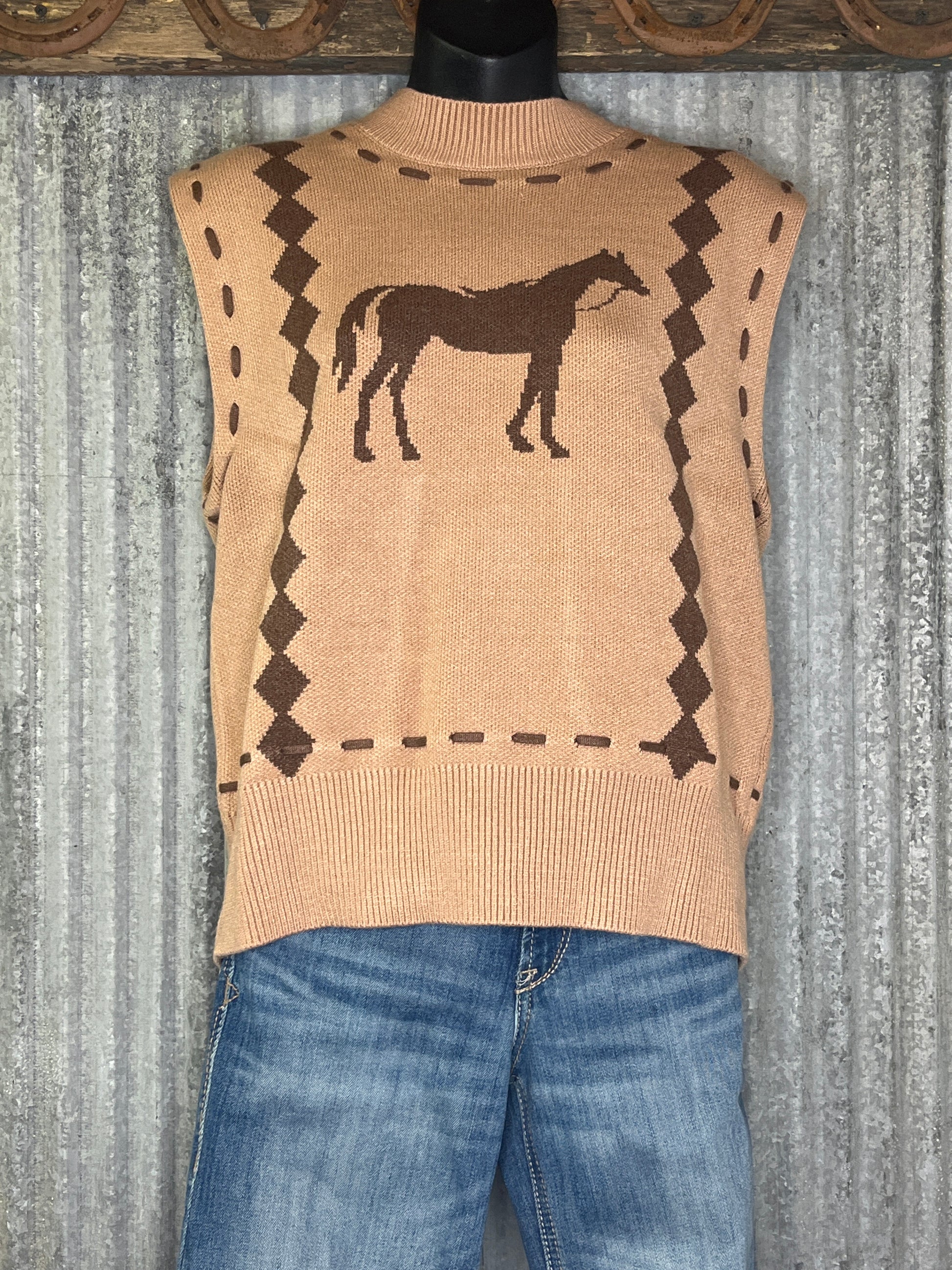 The Asherton sweater vest showcases a refined horse print on both front and back, complemented by intricate diamond patterns. Expertly detailed with buckstitching along the waist, arms, and neckline, this vest combines classic Western craftsmanship with distinctive style for a polished, standout look.