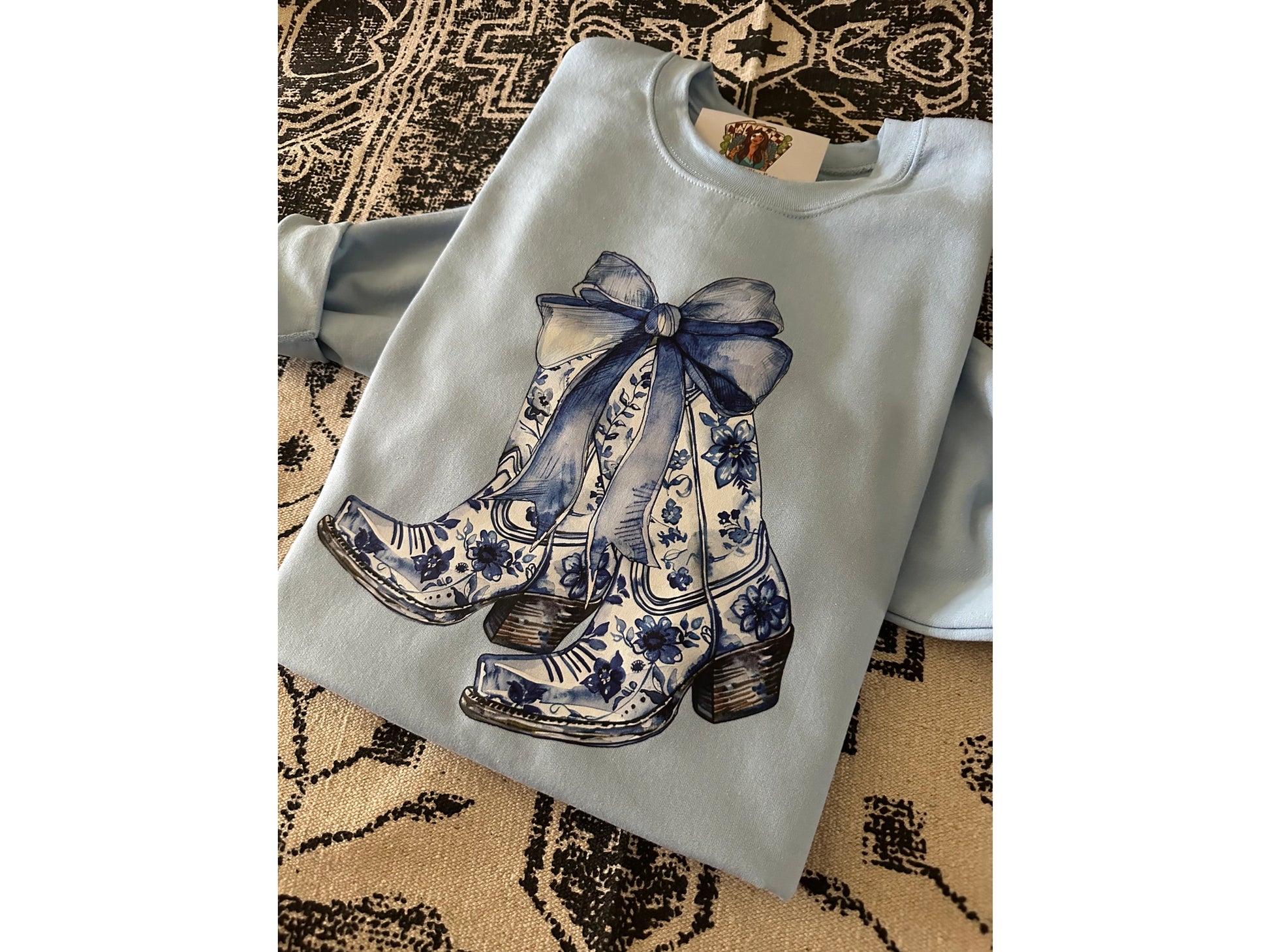 Introducing the Blue Boots Graphic Crew! This stunning unisex crew neck features a cute boots graphic and blue bow, perfect for any occasion. Made with a comfortable fit, it's ideal for both men and women. Upgrade your wardrobe with this must-have piece!