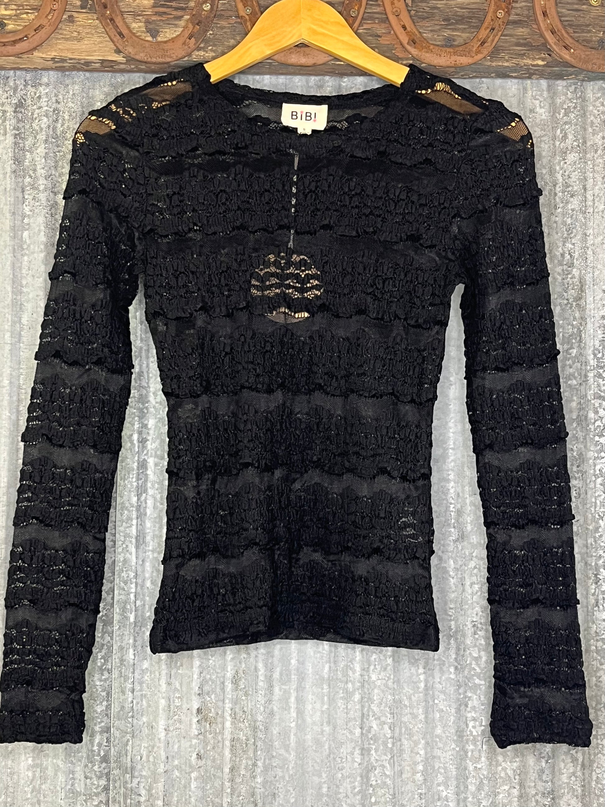 The Caliente Top features delicate lace adorned with tiny ruffles and intricate floral details, offering a feminine and elegant look. Crafted with a stretchy fabric, it provides a snug fit that accentuates your silhouette. For a more relaxed and comfortable wear, consider sizing up. This top blends classic charm with modern comfort, perfect for elevating any outfit.