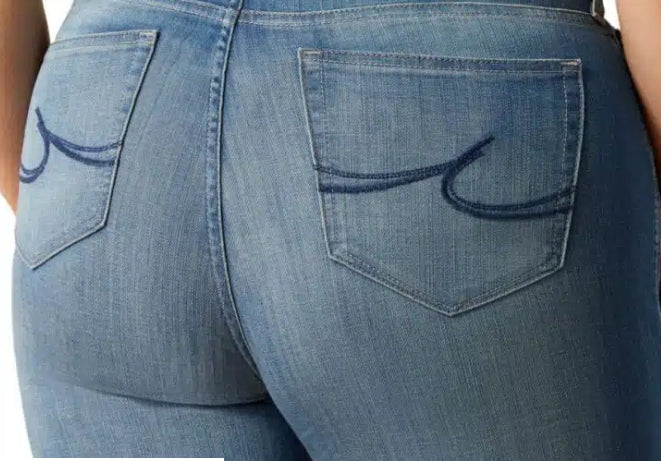 95% Cotton/4% Elasterell-P/1% Elastane; High Rise (10″ Front Rise Sits At The Small Of The Waist); Zip Fly With Button Closure; Whisker And Hand Sanding Details; Contoured Waistband Hugs Your Curves For A Fit That Moves With You; Slim Through Hip And Thigh; Five Pocket Styling; Contrast Embroidered Back Pockets; Gradually Widens From The Knee To 21 ½” Wide Leg Opening; Trouser Hem; Medium Wash; Color: Olympia; Style #10061393