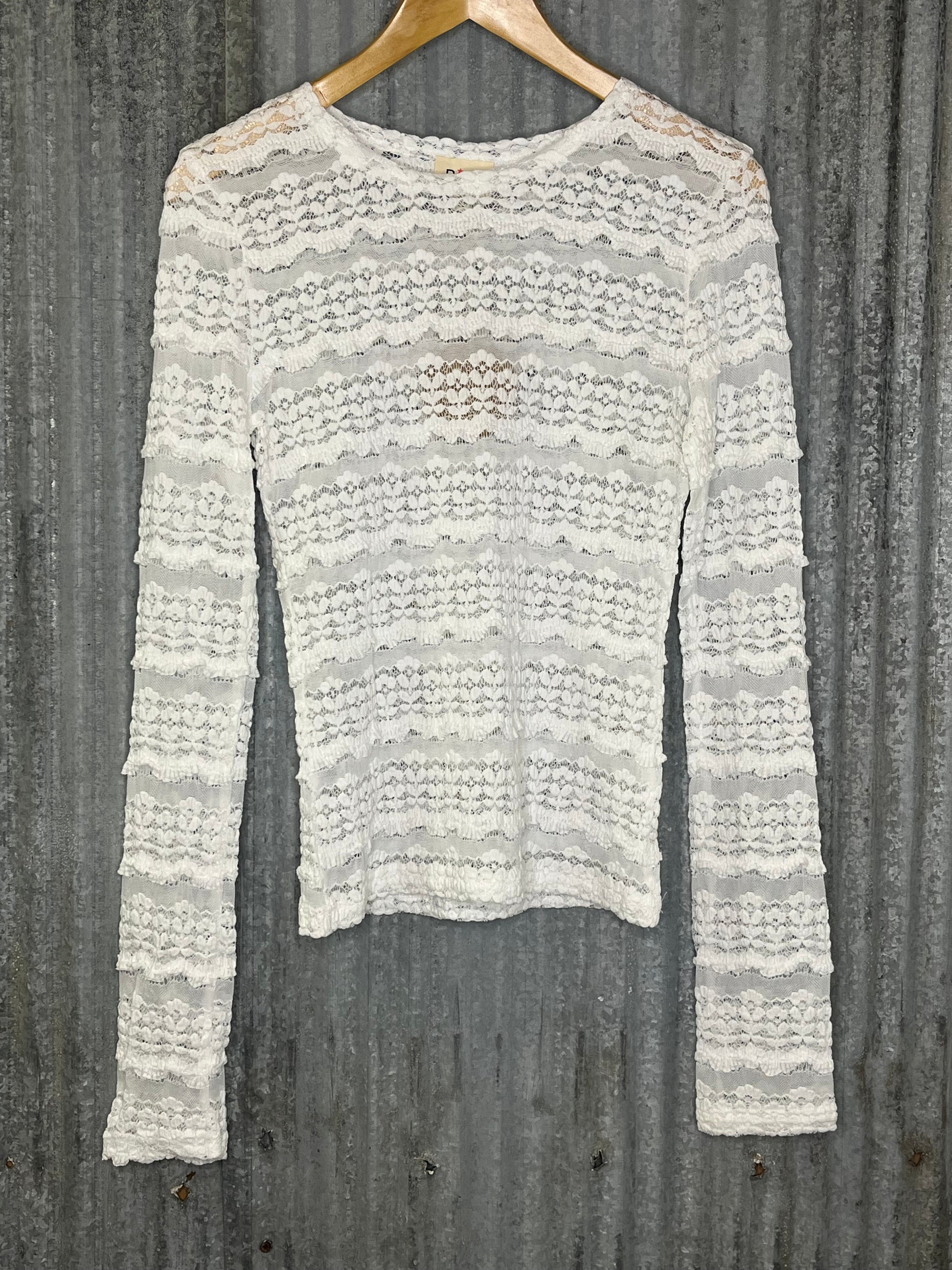 The Emma Top is a delicate off-white lace blouse featuring subtle floral accents and a charming small ruffle detail. Designed for layering, it offers a feminine touch to any outfit. Please note it runs small; sizing up is recommended for a more relaxed fit.