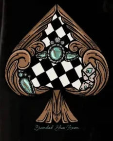 Expertly crafted with a detailed spade design, this black graphic tee offers a unique and stylish addition to your wardrobe. Made with tooled leather, a checkered pattern, and a touch of turquoise, this tee is the perfect statement piece for any outfit. Elevate your style with THE HAYES GRAPHIC TEE.