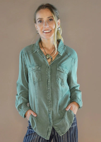 The Juniper Shirt is your new everyday essential, crafted from 100% washed rayon for that perfectly broken-in softness and drape. With its relaxed fit, subtle texture, and western-inspired double chest pockets and pearl snaps, it strikes the balance between laid-back comfort and timeless style. Wear it loose, tucked, or tied—it’s the kind of shirt that feels effortlessly chic no matter how you style it. Models are wearing a size small.