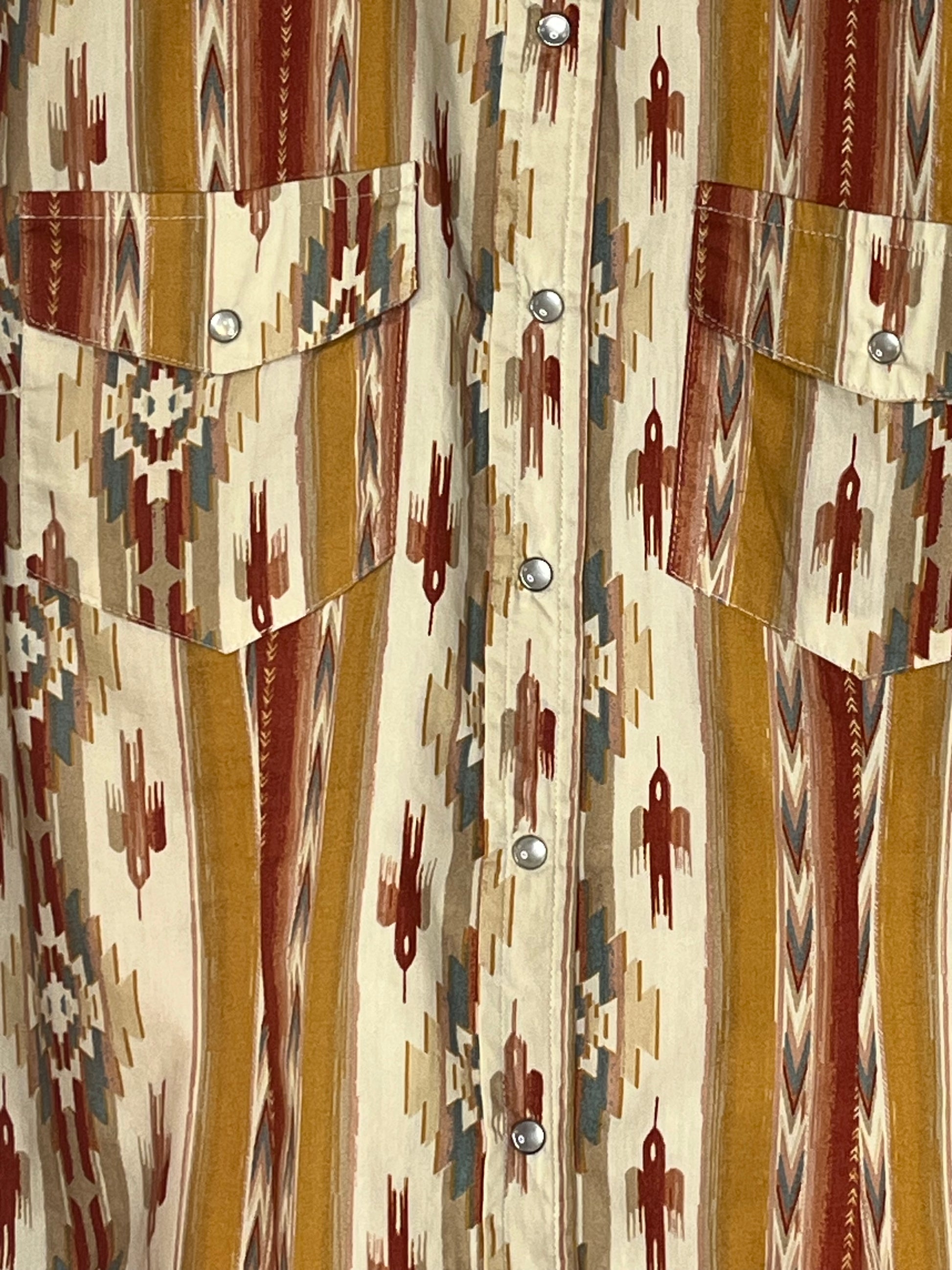 The Peyote Aztec Pearl Snap Shirt brings bold Southwestern spirit to a timeless western classic. Designed in a striking Aztec-inspired stripe, it features authentic pearl snaps, chest pockets, and tailored western yokes. Lightweight and easy to layer, this shirt carries you from rodeo nights to everyday wear with rugged style Model is wearing a size small. 100% Cotton Color - Ivory ground with mustard and rust