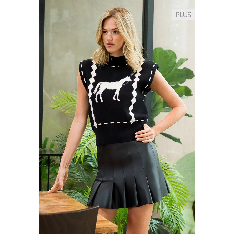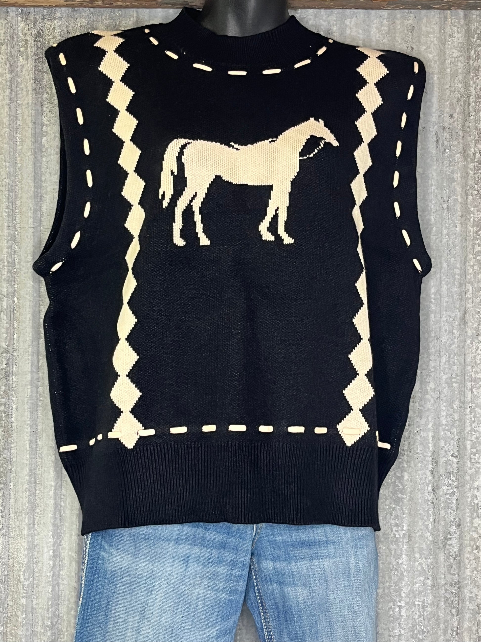 The Plainview sweater vest showcases a striking black and white design featuring a horse and diamond pattern. Its buckstitch-inspired detailing around the waist, sleeves, and collar adds a refined touch, combining classic Western motifs with contemporary style. Crafted for those who appreciate subtle sophistication, this vest blends visual interest with versatile layering potential.