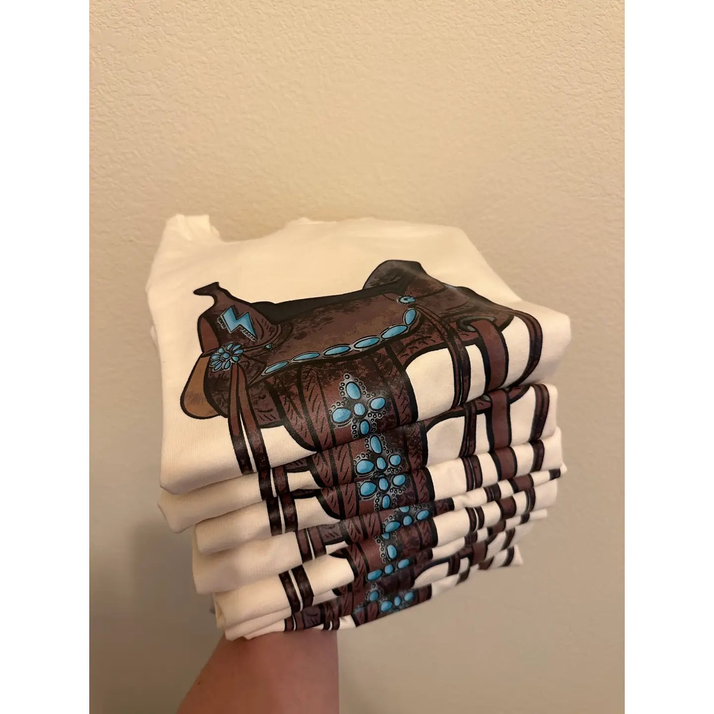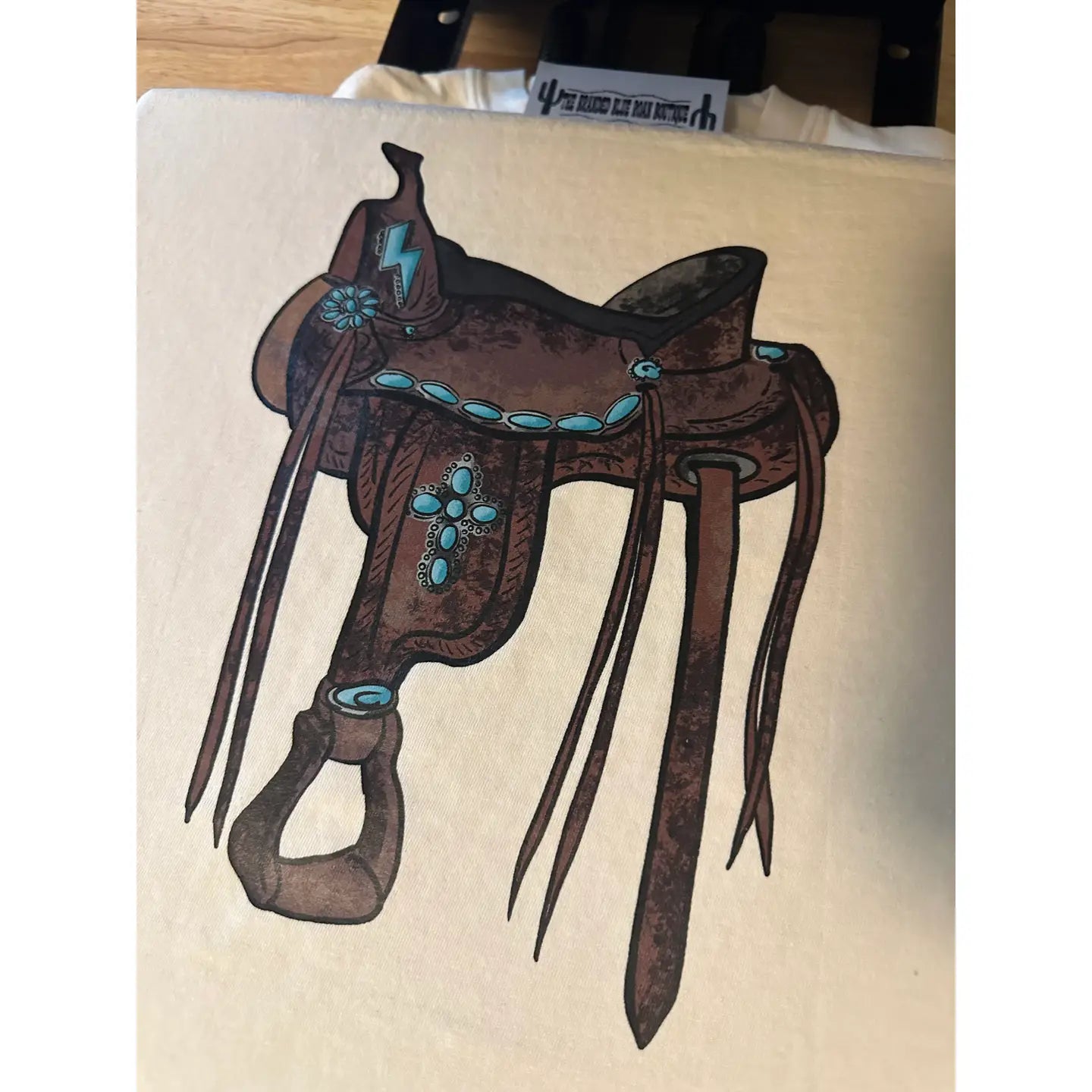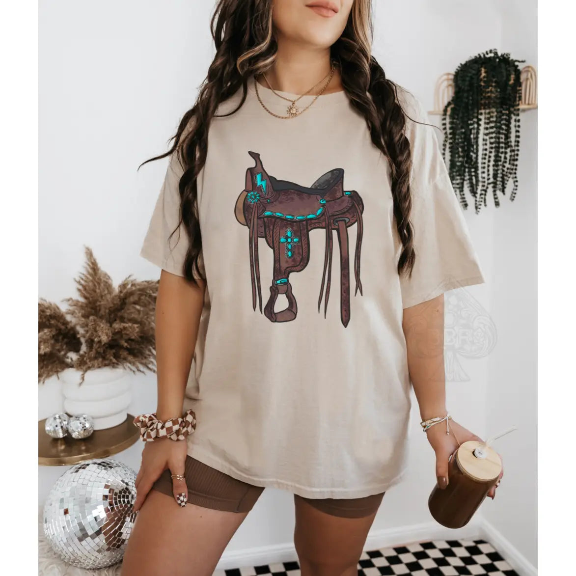 The Sedalia is the perfect addition to your wardrobe. This adorable graphic tee features a stunning saddle graphic in a beautiful turquoise and brown color palette. Made with a Gildan tee in a neutral tan color, this shirt is both stylish and comfortable. Showcase your love for equestrian style with The Sedalia.