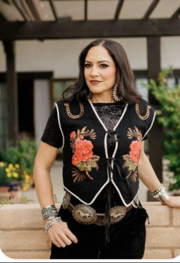 The Wild Rose Vest features a sleek black base adorned with vibrant rose motifs and playful cowgirl-inspired accents. Crafted for style and versatility, it’s perfect for layering over casual or Western-inspired outfits. This vest brings a bold, rodeo-ready flair with a touch of feminine charm to any look.