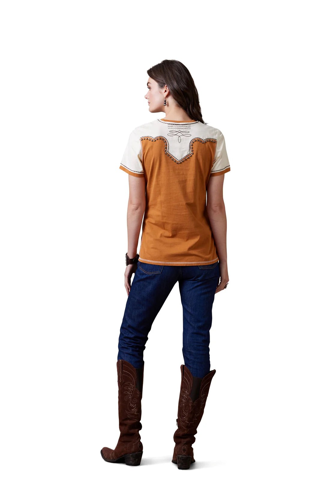 This stunning western top from Double D Ranch showcases authentic craftsmanship with its distinctive yoke detailing across the front and back. The warm pecan hue is beautifully complemented by crisp white and rich brown accents, creating a sophisticated color palette perfect for ranch wear or western-inspired styling. The thoughtfully designed yoke adds dimension and visual interest while maintaining the classic western aesthetic. An excellent choice for those who appreciate quality construction and timeless western fashion.